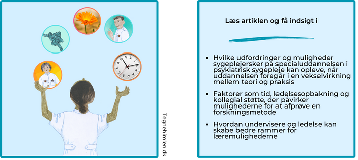 Artiklen omhandler resultaterne af en undersøgelse om sygeplejerskers oplevelser af de betingelser, der påvirker læring og deltagelse på tværs af teoretisk og kliniske dele af Specialuddannelsen i Psykiatrisk Sygepleje, samt hvordan forsknings-metoden fotointerview kan anvendes i praksis og hvilke udfordringer og muligheder, der kan opstå i denne proces.