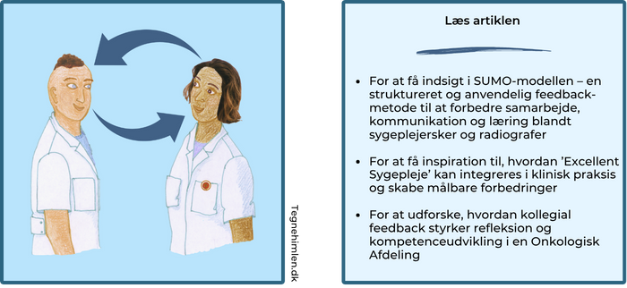 På Onkologisk Afdeling, Vejle Sygehus, Sygehus Lillebælt arbejdes med udvikling af sygeplejen og kompetenceudvikling blandt sygeplejersker og radiografer. Kollegial feedback anvendes som en anerkendende metode til at integrere referencerammen ’Excellent Sygepleje’’ og principperne for Fælles Beslutningstagning.