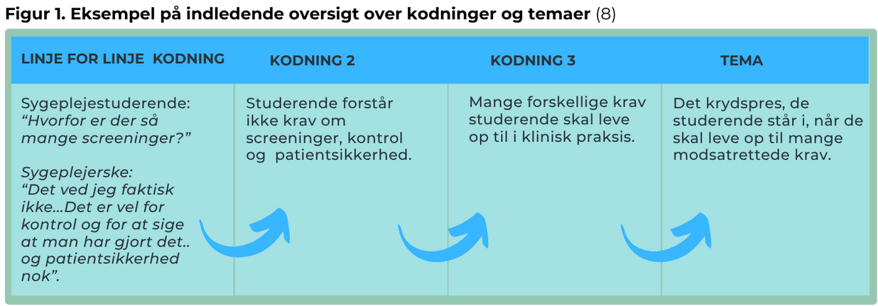 Vi organiserede empirien systematisk og kodede tekstuddrag fra observationer og interviews, og vi dannede mange temaer uden på forhånd at bestemme, hvad der var relevant. Derefter søgte vi efter mønstre i empirien og lavede en foreløbig mapping for at gruppere koder i passende temaer. I gennemgangen af temaerne overvejede vi, om de gav mening og støttede hinanden. Vi vendte tilbage til analysen, justerede temaerne og testede alternative forklaringer. De temaer, vi har fundet frem til, var gennemgående hos de fire studerende, men i varierende grad (se eksempel i Figur 1).