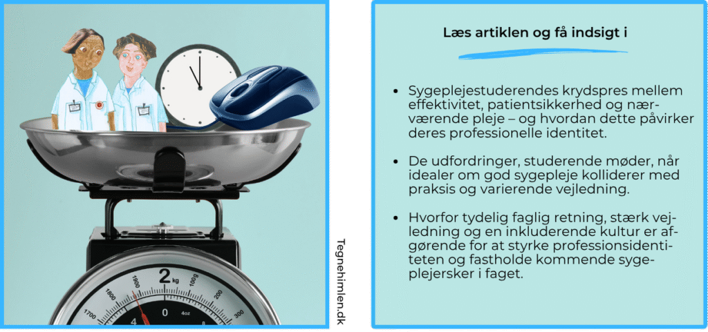 Sygeplejefaget har gennemgået markante forandringer gennem tiden (1), og som sygeplejersker, der arbejder med undervisning og vejledning af studerende på en medicinsk afdeling, er vi særligt engagerede i, hvordan disse ændringer påvirker de studerendes professionelle identitet. Sygeplejens akademisering, det politiske og samfundsmæssige pres samt de ændrede arbejdsvilkår har skabt et arbejdsfelt, hvor de studerende ofte står overfor modsatrettede krav (2). På den ene side forventes de at udvise effektivitet, evidensbaseret praksis og specialisering, mens de på den anden side skal opretholde relationel og omsorgsfuld pleje (3). Denne kontrast kan skabe usikkerhed og frustration hos de studerende, som kæmper med at finde deres professionelle identitet i et miljø præget af tidspres og ressourcemangel.