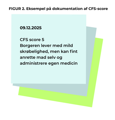 - Et langsigtet mål er, at CFS-scoring inte-greres som en naturlig del af arbejdsgangen ved sygeplejefaglig udredning og ved ændringer i borgerens tilstand.
