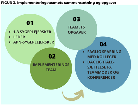 Ifølge Fixsen et al., en amerikansk implementeringsforskergruppe som står bag Implementation Research Network, kræver vellykket implementering, at der skabes implementation-drivers, dvs. organisatoriske og personbårne mekanismer, der understøtter indsatsen i hverdagen (10). Lokale implementeringsteams fungerer netop som sådanne drivere ved at kombinere ledelsesopbakning med faglig ekspertise og kollegial støtte. Med henblik på at skabe lokalt drive og engagement, sikre ejerskab, samt arbejde med praksisnær implementering har hvert område dannet et implementeringsteam bestående af 1-3 sygeplejersker, én leder samt én APN-sygeplejerske.