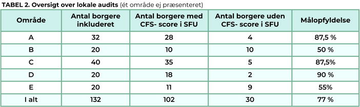 Som beskrevet i afsnittet ovenfor viste dataudtræk for perioden 1. marts – 31. marts, at i gennemsnit 59 % borgere var CFS-scoret. De lokale- og læringsorienterede journalaudits viste imidlertid en højere grad af målopfyldelse med gennemsnitligt 77 % af 20 tilfældige borgere, som var CFS-scoret. Se TABEL 2. Den mellemlange målsætning om, at mindst 50 % af borgerne skal være CFS-scoret, som en naturlig del af den sygeplejefaglige udredning inden udgangen af april 2025, blev dermed opfyldt.