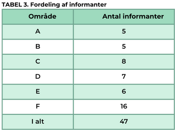 Spørgeskemaundersøgelsen indeholdt en blanding af kvantitative og kvalitative spørgsmål om sygeplejerskernes perspektiver og nuancer på sygeplejerskens arbejde med anvendelse af CFS som et redskab til vurdering af skrøbelighed, se fordeling af informanter i de 6 områder i TABEL 3.