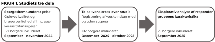 Formålet med studiet var, at undersøge, om anvendelse af tritansugerør kan øge det daglige væskeindtag blandt ældre borgere i kommunale plejeforløb, hvorvidt der findes borgere, som særligt profiterer af interventionen, samt at belyse borgernes oplevelse af kvalitet og brugervenlighed. Studiet bidrager med ny viden ved at kombinere objektive målinger af væskeindtag i praksisnære omgivelser med borgernes subjektive vurderinger af drikkeredskaber.