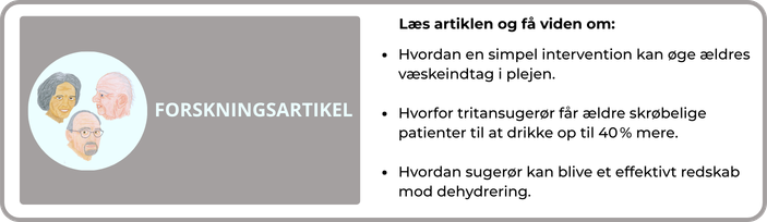 Baggrund: Dehydrering er en hyppig og delvist forebyggelig årsag til funktionsfald og indlæggelser blandt ældre borgere. Mange ældre drikker for lidt på grund af nedsat tørst, funktionstab eller manglende støtte til væskeindtag. Tiltag, der øger drikketilgængeligheden, kan derfor have stor klinisk betydning.