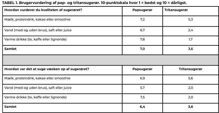 Borgerne blev spurgt direkte ved hjælp af en 10-punkts numerisk skala formuleret som: “På en skala fra 1 til 10, hvor 1 er bedst og 10 er dårligst, hvordan vurderer du …”, således at lavere score angav en mere positiv oplevelse. Den gennemsnitlige vurdering af den overordnede kvalitet var 3,6 for tritansugerør sammenlignet med 7,0 for papsugerør. Tilsvarende blev oplevelsen af sugekomfort vurderet til 3,6 for tritansugerør og 6,4 for papsugerør. Forskellene var konsistente på tværs af væsketyper og mest udtalte ved indtag af varme drikke. For varme drikke var den gennemsnitlige forskel i samlet kvalitetsvurdering over 5 point på den anvendte skala. Gennemsnitlige vurderinger for de enkelte væsketyper fremgår af Tabel 1.