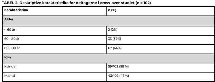 Cross-over-studiet omfattede i alt 102 borgere. Gruppen viste en kønsmæssig fordeling af informanter med deltagelse af 59 kvinder (58 %) og 43 mænd (42 %), se Tabel 2.