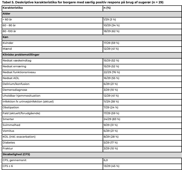 Responder-subgruppen omfattede 29 borgere med en gennemsnitsalder på 80,6 år. Der var en overvægt af kvinder (17/29 kvinder og 12/29 mænd). 22 borgerne havde nedsat funktionsniveau og behov for støtte til daglige aktiviteter. Borgerne var multisyge, med flere kroniske sygdomme, herunder KOL, diabetes og hjertesygdom. Enkelte havde kognitive forstyrrelser såsom demens eller delirium. En betydelig andel af borgerne blev vurderet til at have komplekse plejebehov relateret til funktionstab, sygdomsbyrde og sociale forhold, herunder uholdbare plejesituationer i eget hjem eller nylig udskrivelse fra sygehus. Skrøbelighed var udbredt, med en gennemsnitlig Clinical Frailty Scale (CFS) (21) på 6, svarende til moderat skrøbelighed. 17 ud af 29 borgere havde CFS ≥ 6. Hyppigt forekommende kliniske problemstillinger omfattede nedsat væske- og ernæringsindtag, fald, svimmelhed, smerter og infektioner. Deskriptive karakteristika for gruppen fremgår af Tabel 5.