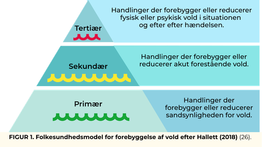 For at understøtte forståelsen af voldsforebyggelse som en løbende proces introduceres i det følgende en model, der kan anvendes i klinisk praksis: Folkesundhedsmodellen for forebyggelse af vold (26). Modellen som er illustreret i FIGUR 1, tilbyder en velkendt ramme, hvor indsatser organiseres i tre niveauer:
