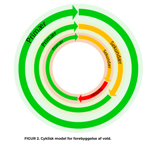 Selvom modellen er velegnet til at kategorisere indsatser, afspejler den ikke fuldt ud den måde, voldforebyggelse udfolder sig i klinisk praksis. I praksis bevæger sundhedsprofessionelle sig ofte kontinuerligt mellem forebyggelsesniveauerne inden for korte tidsrum og i komplekse situationer. For bedre at indfange denne dynamik introduceres derfor en cirkulær model for forebyggelse af vold, som illustrerer voldsforebyggelse som en gentagende og lærende proces, se FIGUR 2.