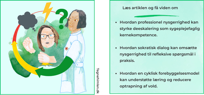 Nysgerrighed beskrives som en relationel og etisk grundholdning, der kan understøtte deeskalering ved at fremme forståelse for adfærdens bagvedliggende årsager. Sokratisk dialog præsenteres som en struktureret måde at omsætte professionel nysgerrighed til refleksive spørgsmål, der kan støtte både patientens og personalets affektregulering og handlemuligheder. En cyklisk model for forebyggelse af vold tydeliggør, hvordan nysgerrighed kan have betydning på tværs af primær, sekundær og tertiær forebyggelse.