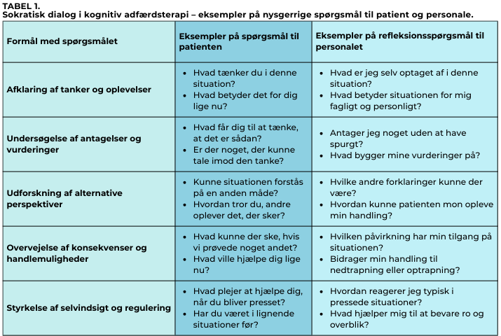 I denne artikel anvendes sokratisk dialog som en struktureret metode til at omsætte professionel nysgerrighed til handling i deeskalerende situationer. Sokratisk dialog, som kendes fra kognitiv adfærdsterapi (KAT), tilbyder en systematisk tilgang til udforskning af tanker, antagelser og følelsesmæssige reaktioner gennem åbne og refleksive spørgsmål (28,29). I deeskaleringsarbejde kan denne tilgang støtte patienter i at regulere affekt, identificere uhensigtsmæssige tankemønstre og overveje alternative handlemuligheder. Samtidig kan sokratisk dialog understøtte samarbejde og fælles problemløsning, som er centrale elementer i effektiv deeskalering (30).