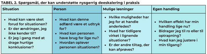 Eksempler på spørgsmålene er samlet i Tabel 2. Tabellen illustrerer en enkel refleksionsramme, der kan anvendes i realtid eller efterfølgende med spørgsmål, der understøtter en nysgerrig og refleksiv tilgang til deeskalering.